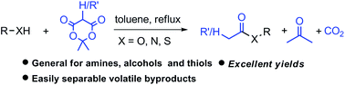Environmentally benign decarboxylative N-, O-, and S-acetylations and acylations